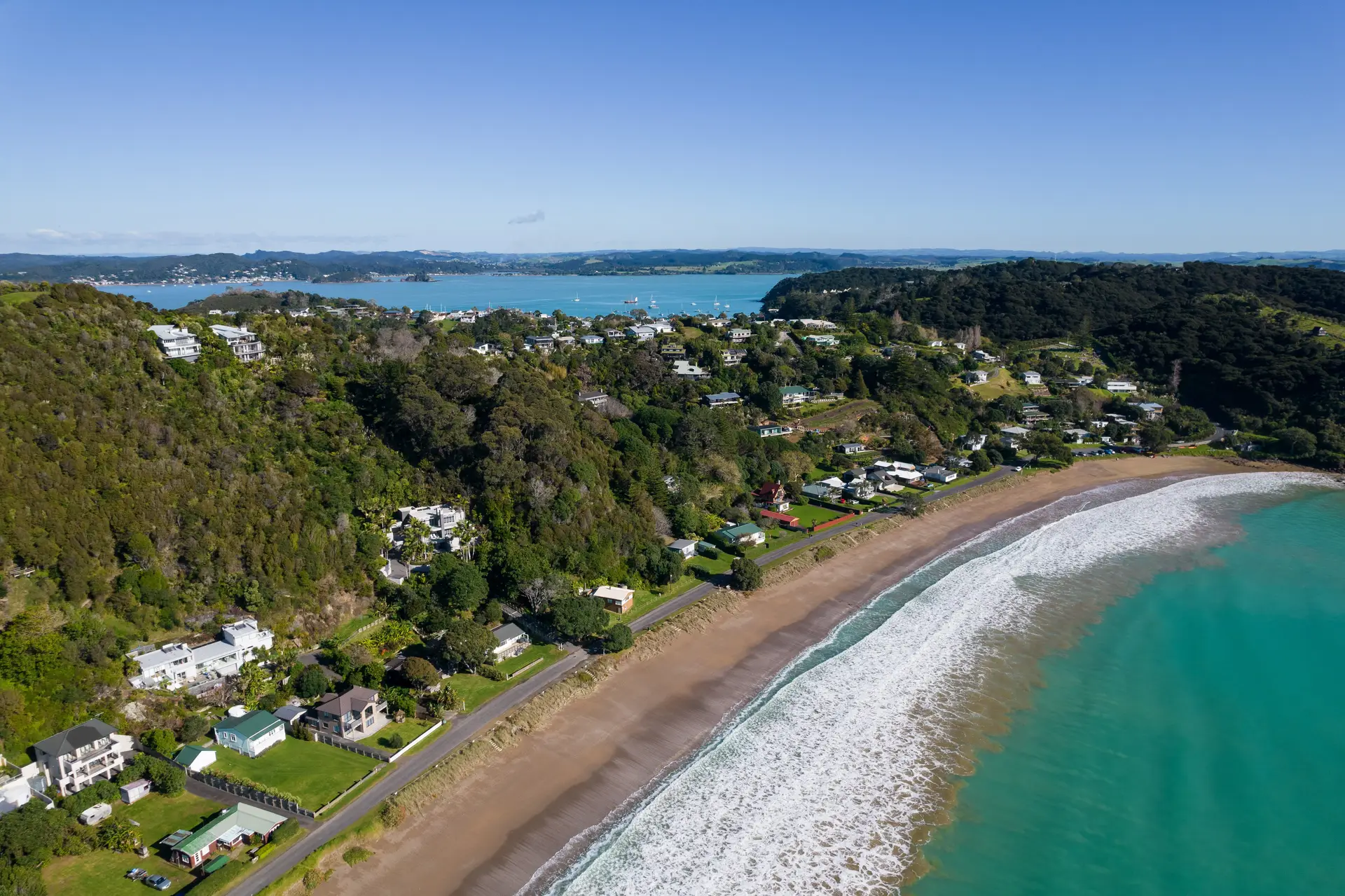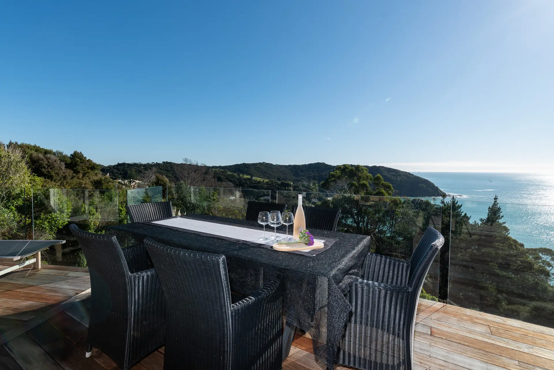 Heaven NZ is a gated property located on a cliff top at 37 Russell Heights in the Bay of Islands, offering an enhanced sense of security. Overlooking Oneroa Bay, Roberton Island, and the Bay of Islands, this stunning villa provides breathtaking views and a serene, private retreat for its guests.