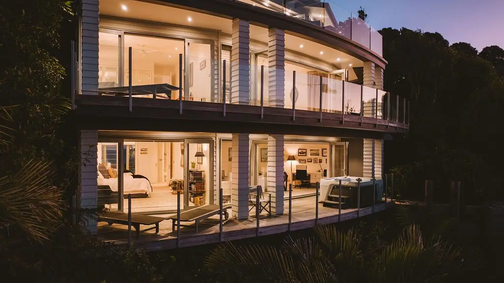 Multiple cliff-top entertaining areas, both inside and outside, offer stunning views of the bay and the beach below. Relax in front of a cosy wood fire inside, or enjoy the ambience of a gas fire outside. You can cook your favourite BBQ, or have a chef prepare it for you. Recline on the loungers available on all three levels of the house, or simply unwind in the spa with a glass of wine while taking in the views. With two lovely lounges to choose from, you can always find the perfect spot to suit your mood.